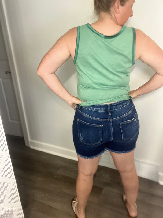 Risen High Rise Distressed Mid Thigh Shorts