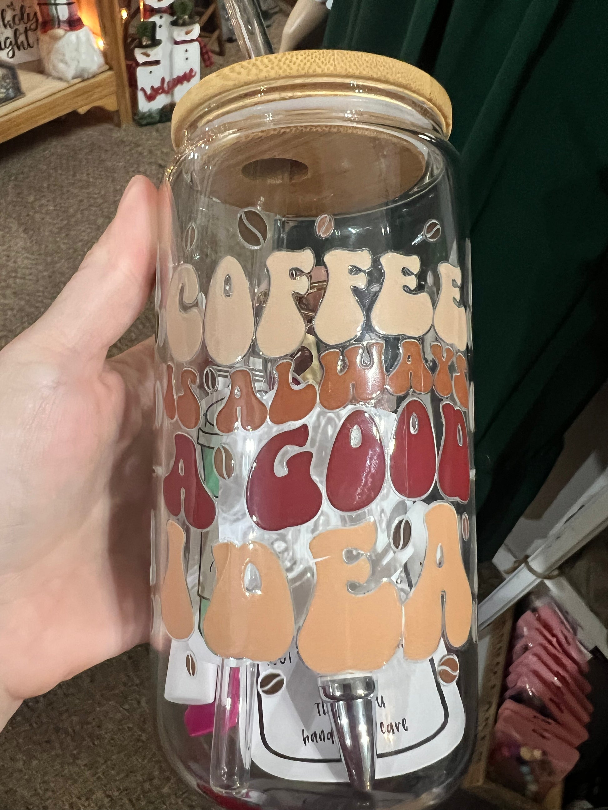 "Satisfy your coffee cravings with our Coffee Inspired Water Glass! Whether you prefer a hot or cold beverage, this glass has got you covered. And with its bamboo lid and glass straw, it's eco-friendly too. Perfect for the quirky coffee lover in you!"